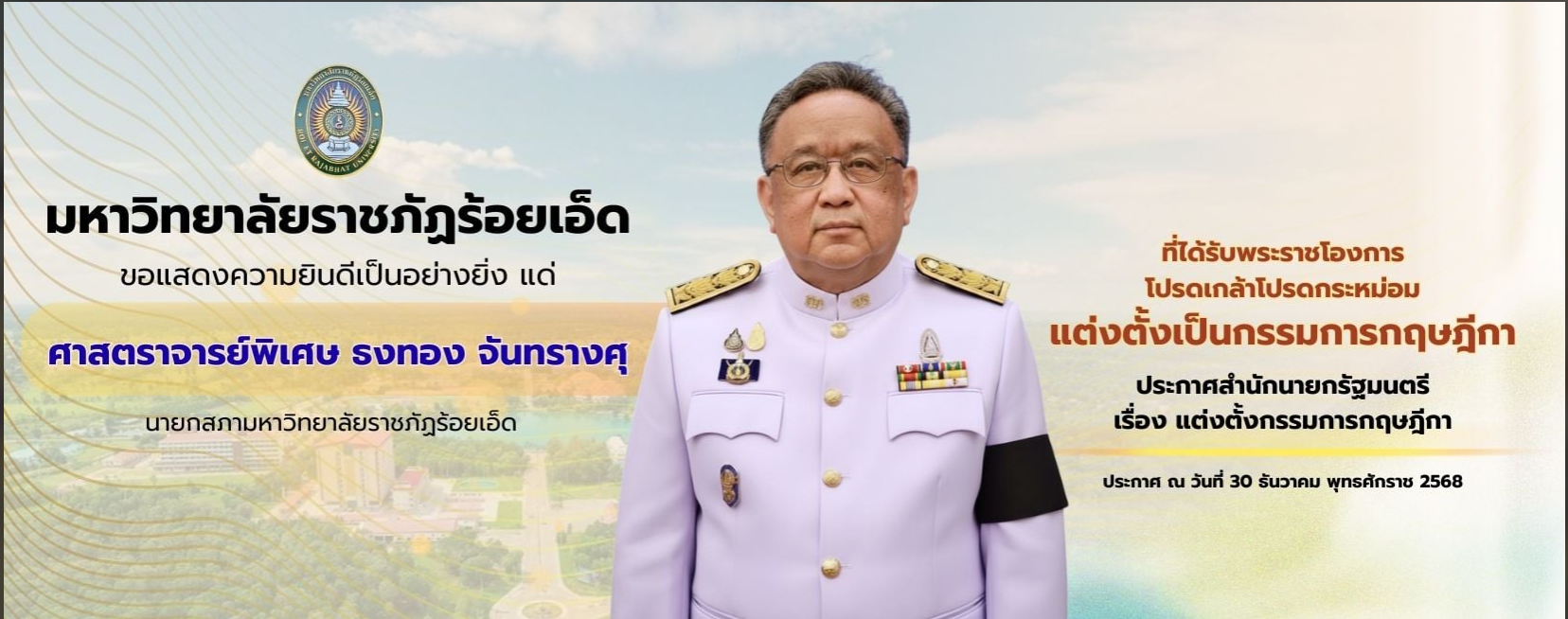 ขอแสดงความยินดีเป็นอย่างยิ่ง เนื่องในโอกาสที่ ศาสตราจารย์พิเศษ ธงทอง จันทรางศุ นายกสภามหาวิทยาลัยราชภัฏร้อยเอ็ด