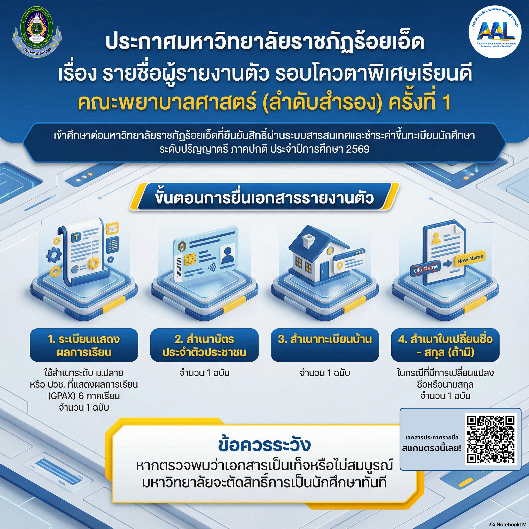 ประกาศรายชื่อผู้รายงานตัวเข้าศึกษาต่อมหาวิทยาลัยราชภัฏร้อยเอ็ด รอบโควตาพิเศษเรียนดี คณะพยาบาลศาสตร์ (ลำดับสำรอง) ครั้งที่ 1
