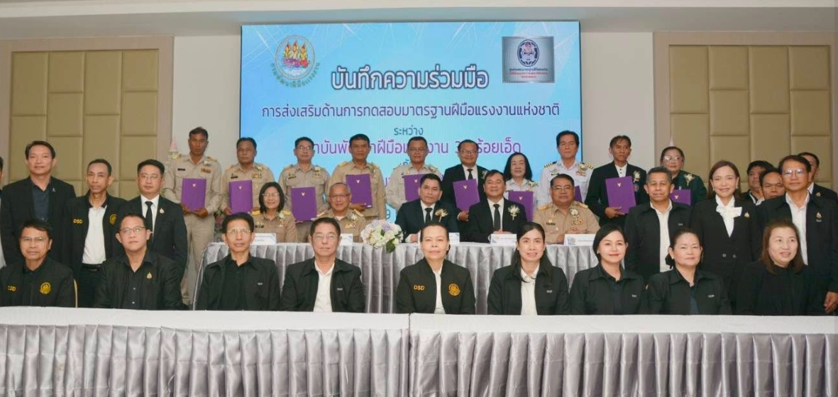 มหาวิทยาลัยราชภัฏร้อยเอ็ด ร่วมพิธีลงนามความร่วมมือทดสอบมาตรฐานฝีมือแรงงาน เชื่อมการเรียนรู้สู่ระบบธนาคารหน่วยกิต วันที่ 19 มกราคม 2569 เวลา 09.30 น. ผู้ช่วยศาสตราจารย์ ดร.ธนาภรณ์ พันทวี รองอธิการบดีฝ่ายวิชาการและการจัดการเรียนรู้ตลอดชีวิต เข้าร่วมพิธีลงนามความร่วมมือด้านการทดสอบมาตรฐานฝีมือแรงงาน ระหว่างสถาบันพัฒนาฝีมือแรงงาน 39 ร้อยเอ็ด กับศูนย์ทดสอบมาตรฐานฝีมือแรงงานในเขตพื้นที่จังหวัดร้อยเอ็ด จำนวน 13 แห่ง โดยมีนายสมชาติ สุภารี รองอธิบดีกรมพัฒนาฝีมือแรงงาน เป็นประธานในพิธี