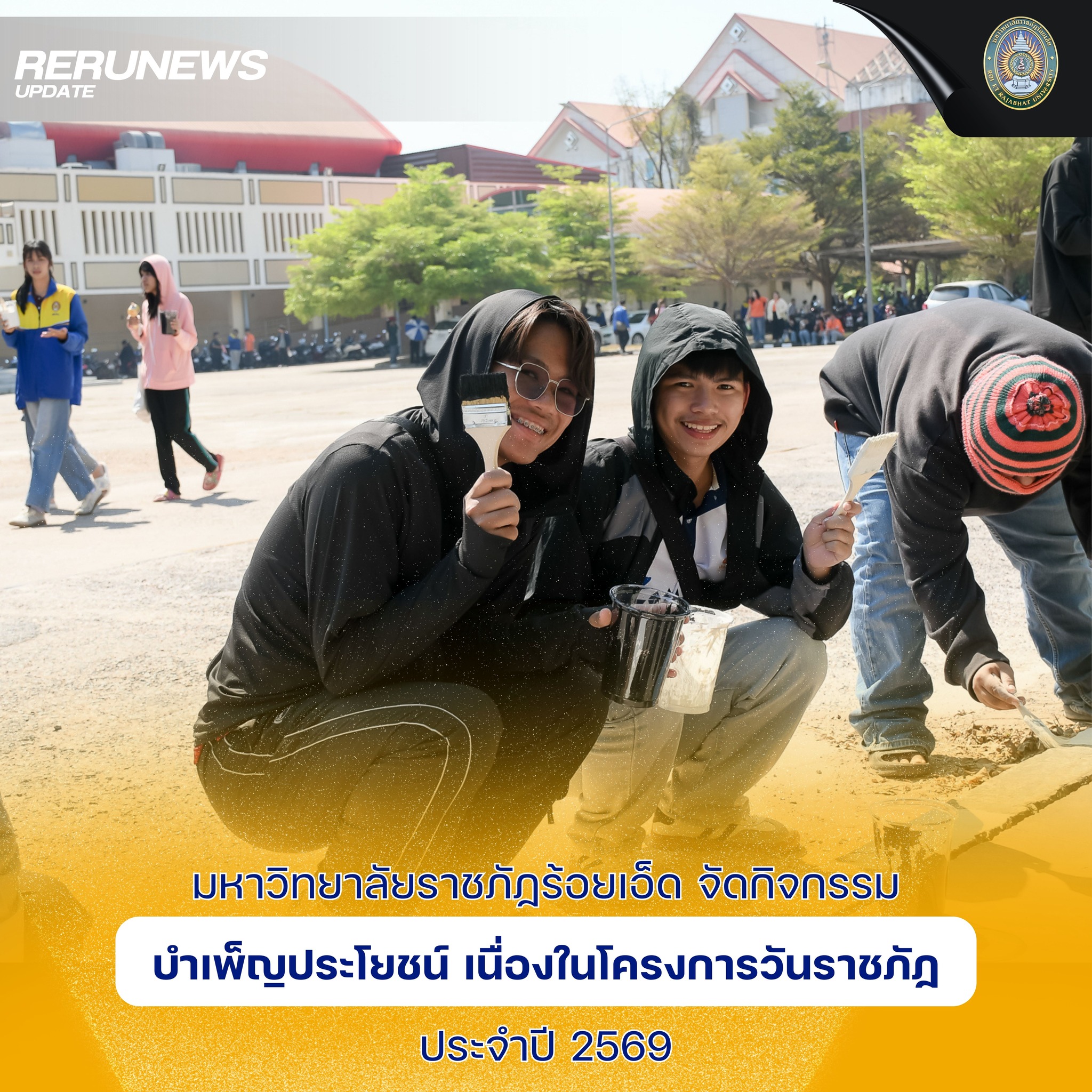 เมื่อวันที่ 13 กุมภาพันธ์ 2569 เวลา 13.00 น. มหาวิทยาลัยราชภัฏร้อยเอ็ด จัดกิจกรรมบำเพ็ญประโยชน์ เนื่องในโครงการวันราชภัฏ ประจำปี 2569 ณ บริเวณโดยรอบมหาวิทยาลัยราชภัฏร้อยเอ็ด โดยมีคณาจารย์ บุคลากร และนักศึกษา เข้าร่วมกิจกรรมอย่างพร้อมเพรียง เพื่อร่วมแสดงพลังจิตอาสา สร้างประโยชน์แก่สังคม และพัฒนาสภาพแวดล้อมภายในมหาวิทยาลัยให้สะอาด เป็นระเบียบ และสวยงาม