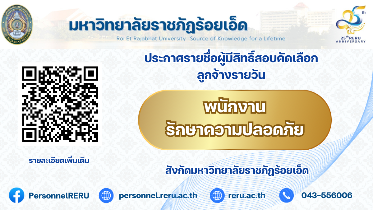 ประกาศรายชื่อผู้มีสิทธิ์สอบคัดเลือกเพื่อบรรจุเป็นลูกจ้างรายวัน ตำแหน่ง: พนักงานรักษาความปลอดภัย มหาวิทยาลัยราชภัฏร้อยเอ็ด