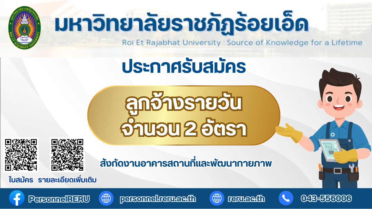 ประกาศรับสมัครลูกจ้างรายวันจำนวน: 2 อัตราสังกัด: งานอาคารสถานที่และพัฒนากายภาพมหาวิทยาลัยราชภัฏร้อยเอ็ด