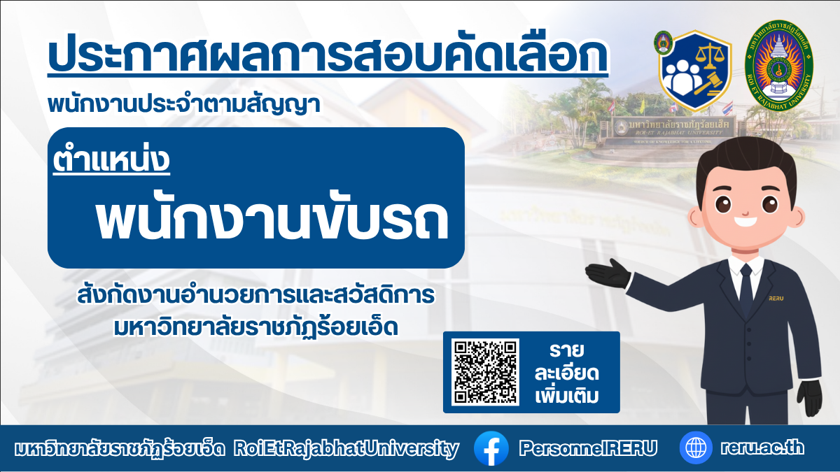 ประกาศผลการสอบคัดเลือกเพื่อบรรจุเป็นพนักงานประจำตามสัญญา ตำแหน่งพนักงานขับรถ มหาวิทยาลัยราชภัฏร้อยเอ็ด