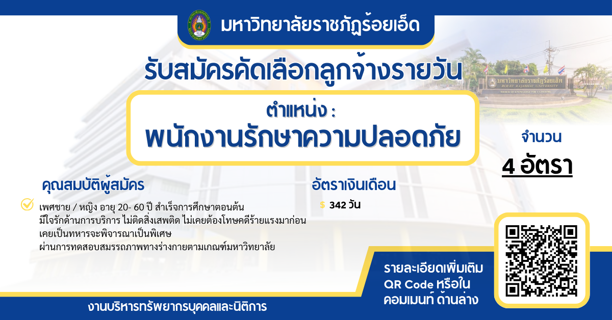 มหาวิทยาลัยราชภัฏร้อยเอ็ด รับสมัครลูกจ้างรายวัน ตำแหน่งพนักงานรักษาความปลอดภัย จำนวน 4 อัตรา ค่าจ้าง 342 บาทต่อวัน ตรวจสอบคุณสมบัติและสมัครได้ที่นี่