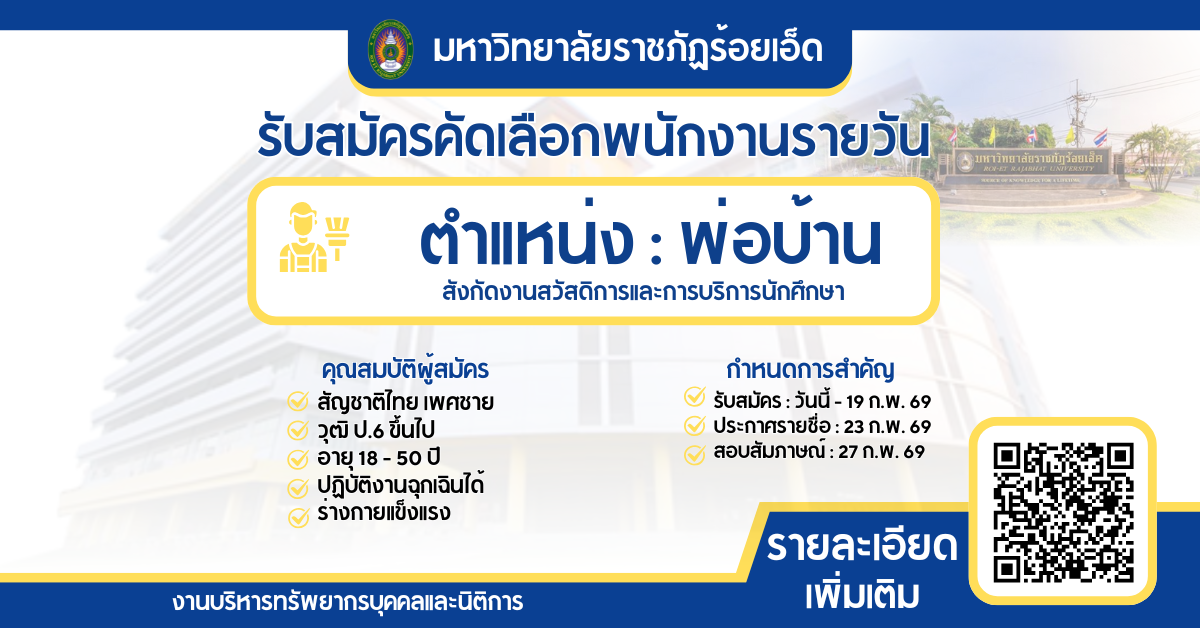 มหาวิทยาลัยราชภัฏร้อยเอ็ด รับสมัครพนักงานรายวัน ตำแหน่งพ่อบ้าน สังกัดงานสวัสดิการและการบริการนักศึกษา