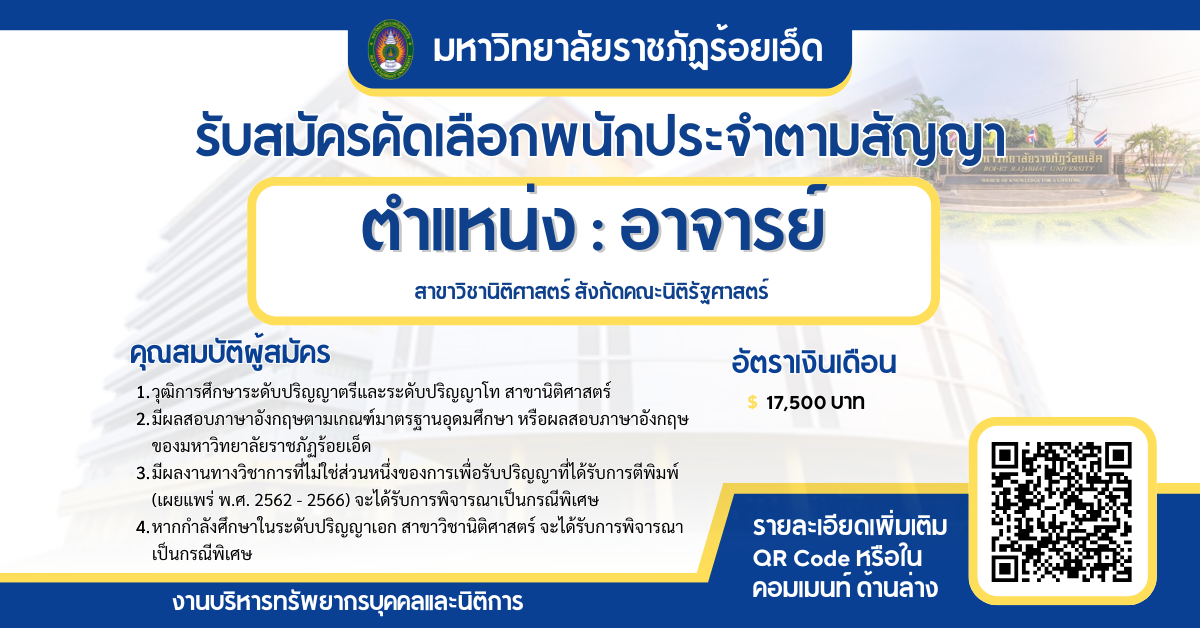 มหาวิทยาลัยราชภัฏร้อยเอ็ด เปิดรับสมัครบุคคลเพื่อคัดเลือกเป็น พนักงานประจำตามสัญญา ตำแหน่งอาจารย์ สาขาวิชานิติศาสตร์ สังกัดคณะนิติรัฐศาสตร์