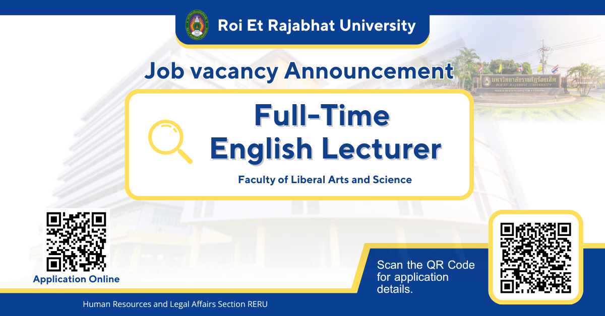 Roi Et Rajabhat University is inviting applications for the position of Full-time English Lecturer in the Business English Program, Faculty of Liberal Arts and Science, on a year-to-year contract basis.