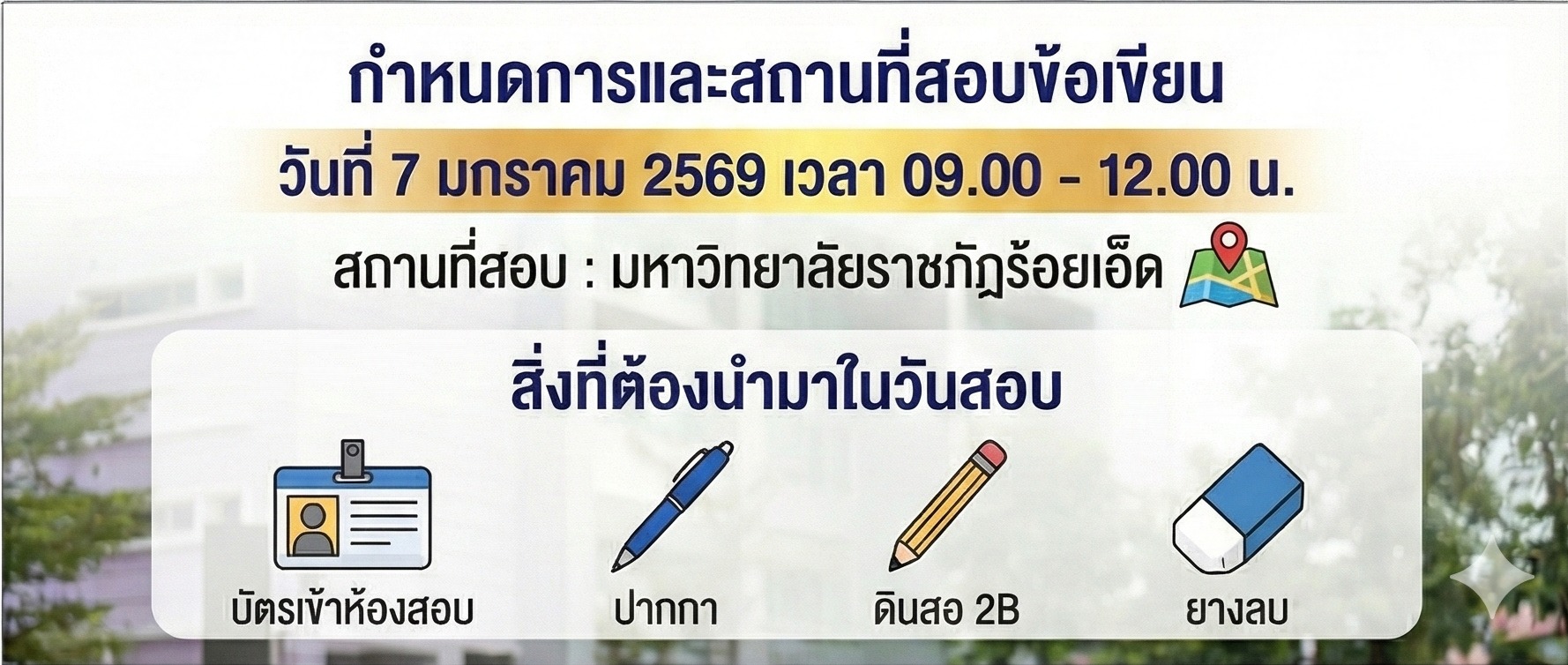 ประกาศมหาวิทยาลัยราชภัฏร้อยเอ็ด เรื่อง รายชื่อผู้มีสิทธิ์ สอบคัดเลือกนักศึกษา ภาคปกติ รอบรับตรง คณะพยาบาลศาสตร์ เพื่อเข้าศึกษาต่อมหาวิทยาลัยราชภัฏร้อยเอ็ด ประจำปีการศึกษา 2569 (เพิ่มเติม ครั้งที่ 1)