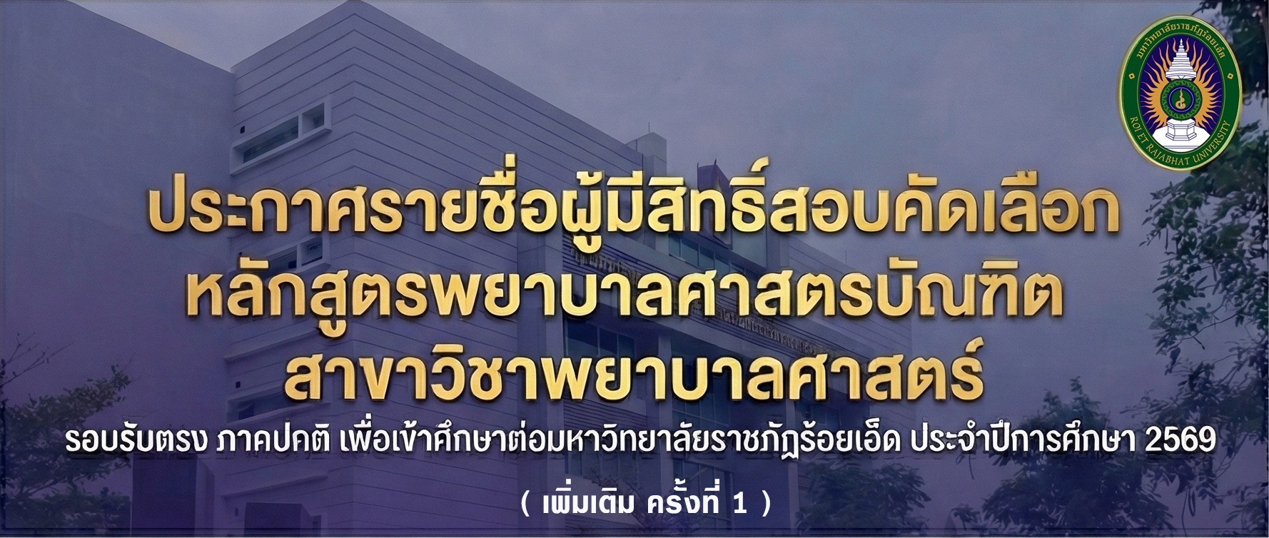 ประกาศมหาวิทยาลัยราชภัฏร้อยเอ็ด เรื่อง รายชื่อผู้มีสิทธิ์ สอบคัดเลือกนักศึกษา ภาคปกติ รอบรับตรง คณะพยาบาลศาสตร์ เพื่อเข้าศึกษาต่อมหาวิทยาลัยราชภัฏร้อยเอ็ด ประจำปีการศึกษา 2569 (เพิ่มเติม ครั้งที่ 1)