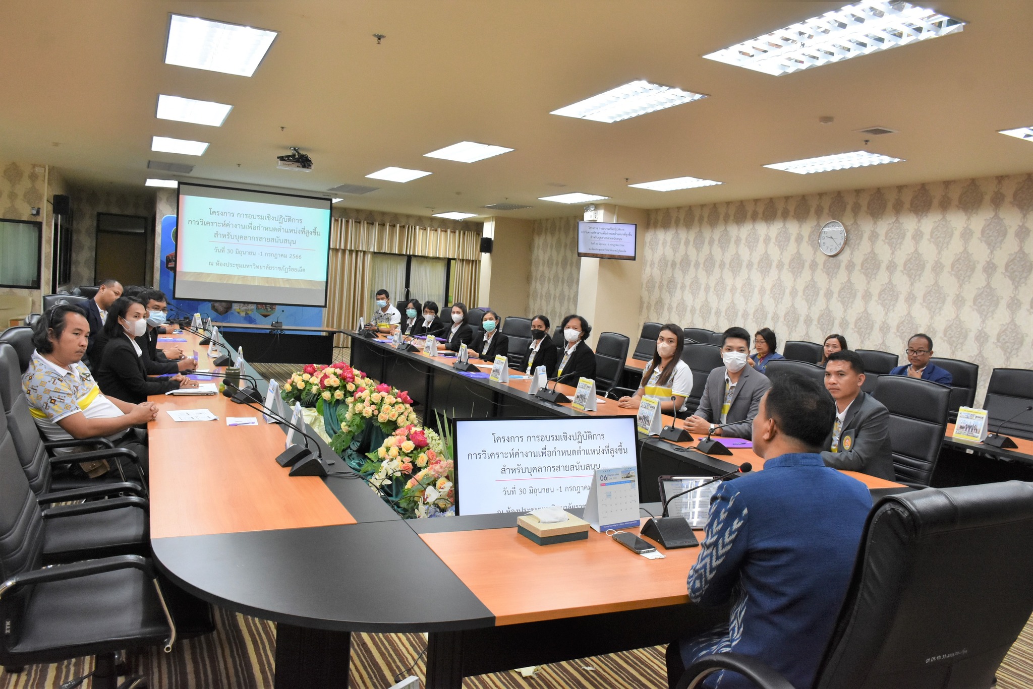 วันศุกร์ที่ 30 มิถุนายน พ.ศ. 2566 เวลา 09.00 น. ณ ห้องประชุมราชพฤกษ์ ชั้น 2 ศูนย์ฝึกประสบการณ์วิชาชีพ ราชภัฏกรีนวิว ท่านผู้ช่วยศาสตราจารย์ ดร.วิชิต กำมันตะคุณ รักษาราชการแทนอธิการบดี มหาวิทยาลัยราชภัฏร้อยเอ็ด กล่าวต้อนรับรองคณบดี ผู้ช่วยคณบดี บุคลากรสายสนับสนุน ของคณะวิทยาศาสตร์และเทคโนโลยี มหาวิทยาลัยราชภัฏสุรินทร์ ที่ได้เข้าร่วมโครงการอบรมเชิงปฏิบัติการ การวิเคราะห์ค่างานเพื่อกำหนดตำแหน่งที่สูงขึ้น สำหรับบุคลากรสายสนับสนุน ของคณะวิทยาศาสตร์และเทคโนโลยี มหาวิทยาลัยราชภัฏสุรินทร์ โดยมีทีมวิทยากรของมหาวิทยาลัยราชภัฏร้อยเอ็ด ซึ่งนำโดย คุณทินภัทร โพธิ์ชัย นักวิชาการศึกษา ชำนาญการ รักษาการผู้อำนวยการกองกลาง สำนักงานอธิการบดี มีคุณดารณี เนตรถาวร เจ้าหน้าที่บริหารงานทั่วไป ชำนาญการ และคุณสุภาวดี ศรีลัย นักวิชาการศึกษา ชำนาญการ สำนักวิชาการและประมวลผล ร่วมเป็นวิทยากรในครั้งนี้ด้วย