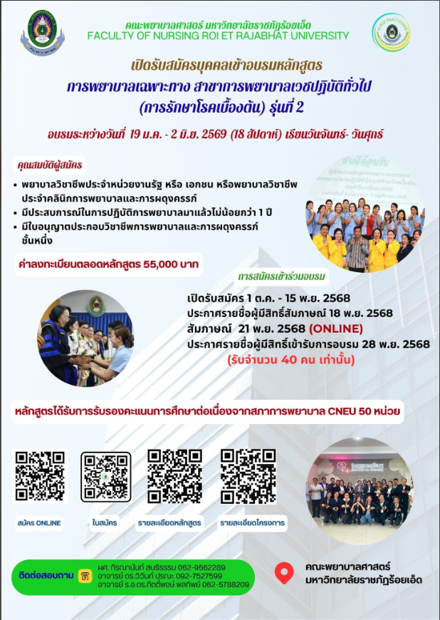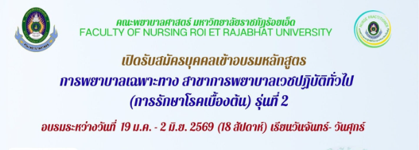 มาแล้ววว… โครงการอบรมดี ๆ สำหรับพยาบาลที่อยากพัฒนาตนเอง โครงการฝึกอบรมระยะสั้น การพยาบาลเฉพาะทาง สาขาเวชปฏิบัติทั่วไป (การรักษาโรคเบื้องต้น) รุ่นที่ 2 โดยคณะพยาบาลศาสตร์ มหาวิทยาลัยราชภัฏร้อยเอ็ด