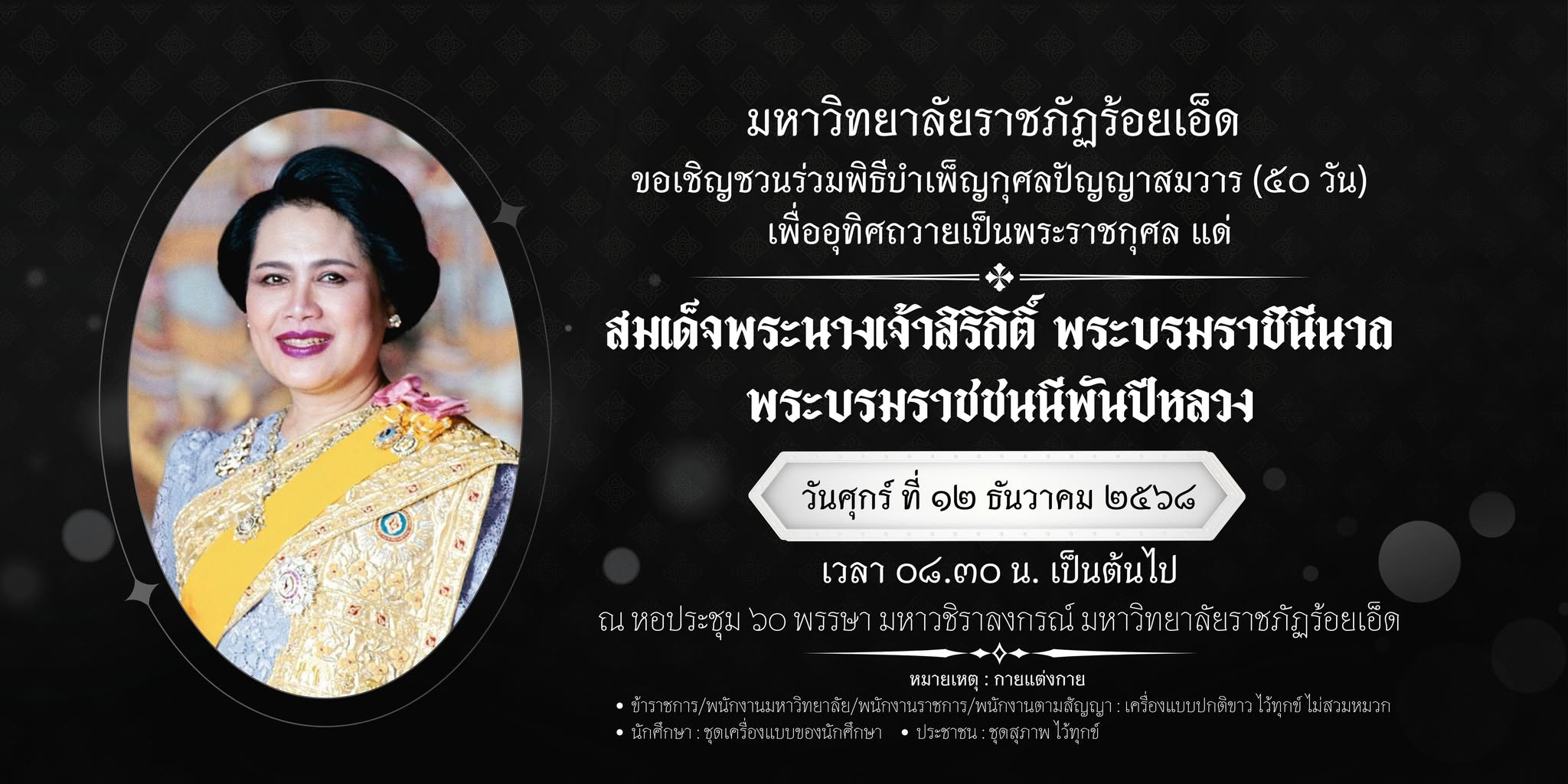 ขอเชิญชวนร่วมพิธีบำเพ็ญกุศลปัญญาสมวาร (50 วัน) เพื่ออุทิศถวายเป็นพระราชกุศล สมเด็จพระนางเจ้าสิริกิติ์ พระบรมราชินีนาถ พระบรมราชชนนีพันปีหลวง ในวันศุกร์ที่ 12 ธันวาคม 2568 ณ หอประชุม 60 พรรษา มหาวชิราลงกรณ์ มหาวิทยาลัยราชภัฏร้อยเอ็ด