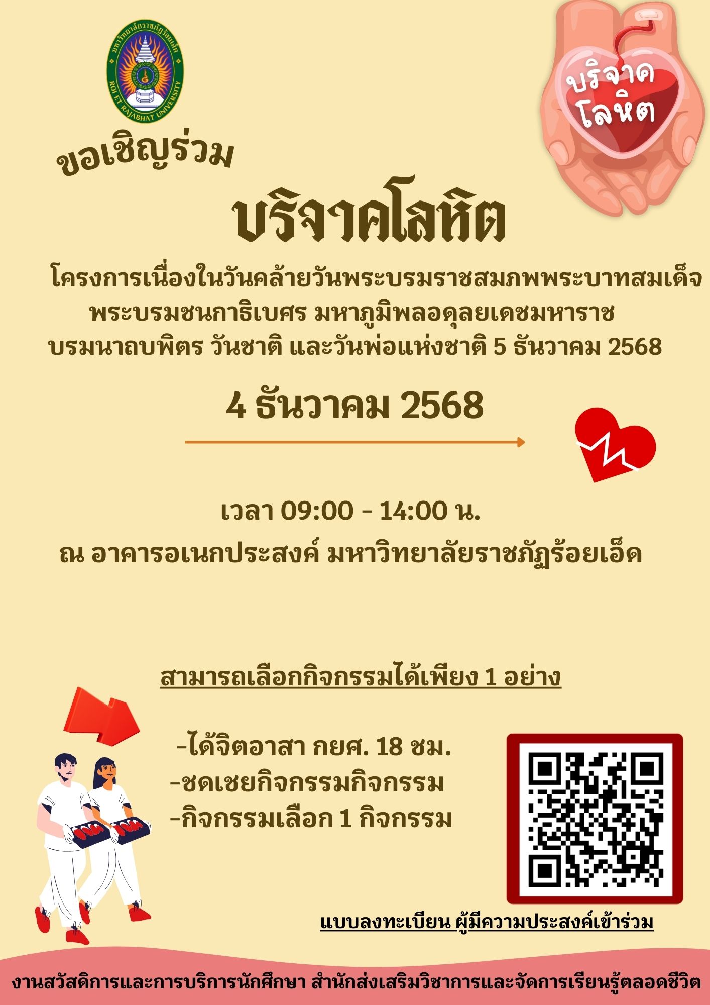 (กิจกรรมบริจาคโลหิต) ในวันที่ 4 ธันวาคม 2568 เวลา 09.00-14.00 น.ณ อาคารอเนกประสงค์ มหาวิทยาลัยราชภัฏร้อยเอ็ด