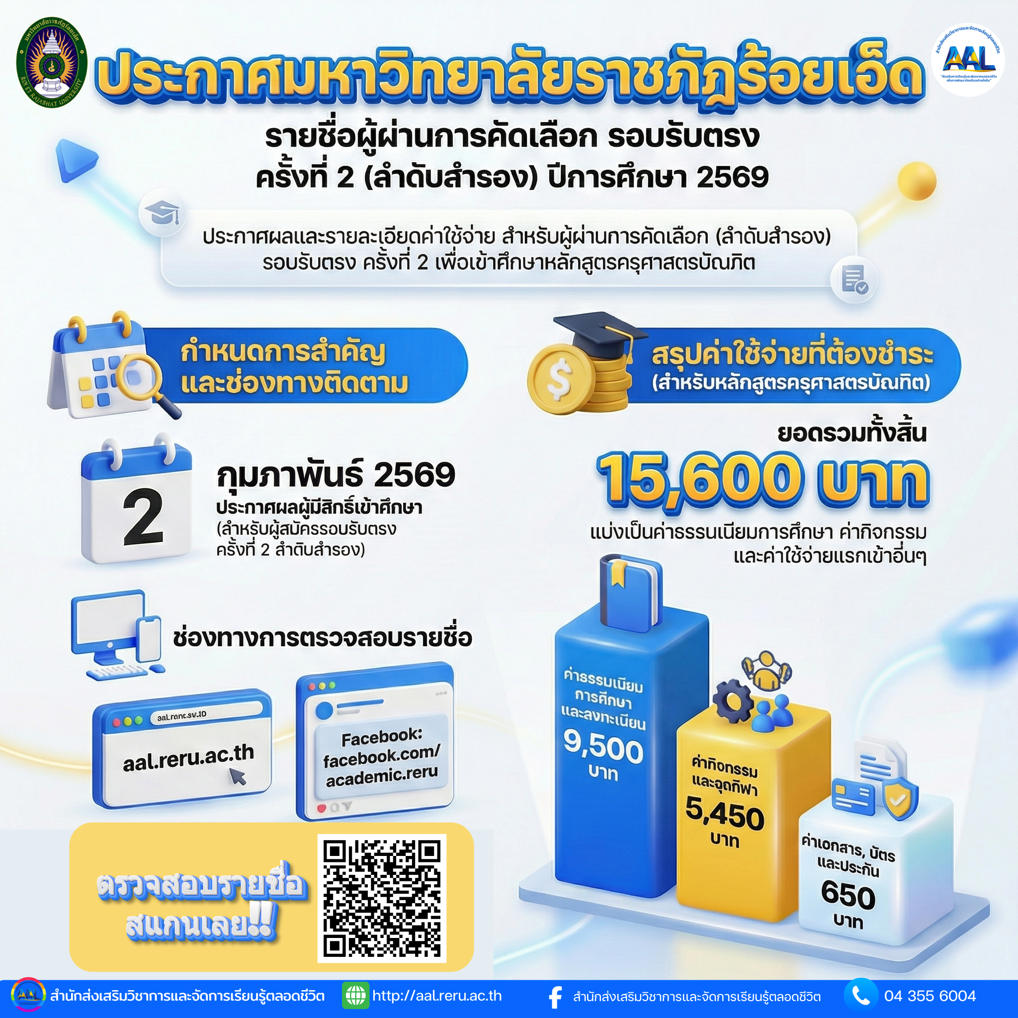 ประกาศมหาวิทยาลัยราชภัฏร้อยเอ็ด เรื่อง รายชื่อผู้ผ่านการสอบคัดเลือกเข้าศึกษาต่อมหาวิทยาลัยราชภัฏร้อยเอ็ด ระดับปริญญาตรี ภาคปกติ รอบรับตรง ครั้งที่ 2 (ลำดับสำรอง) ประจำปีการศึกษา 2569