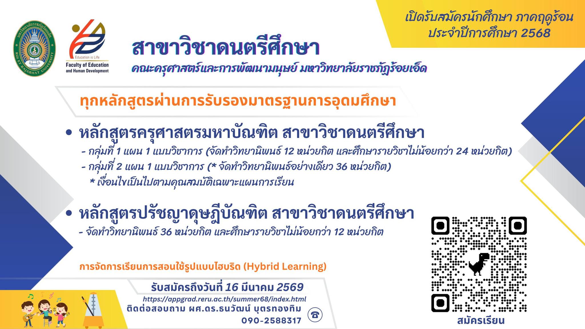 **ประชาสัมพันธ์การรับสมัครนักศึกษาระดับบัณฑิตศึกษา (ภาคฤดูร้อน ปีการศึกษา 2568)** บัณฑิตวิทยาลัย มหาวิทยาลัยราชภัฏร้อยเอ็ด** ร่วมกับ **สาขาวิชาดนตรีศึกษา** คณะครุศาสตร์และการพัฒนามนุษย์ มหาวิทยาลัยราชภัฏร้อยเอ็ด