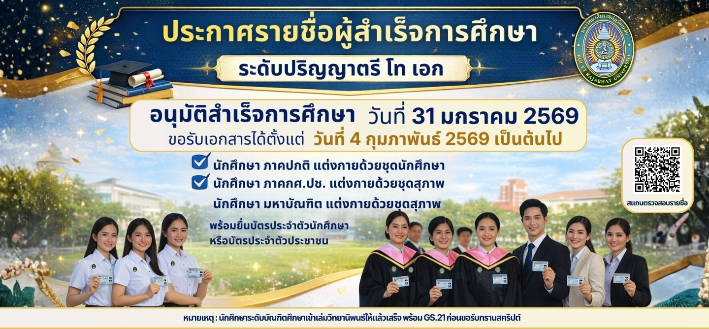 ประกาศรายชื่อผู้สำเร็จการศึกษา อนุมัติสำเร็จการศึกษา ระดับปริญญาตรี โท เอก ขอรับเอกสารได้ตั้งแต่ วันที่ 4 กุมภาพันธ์ 2569 เป็นต้นไป