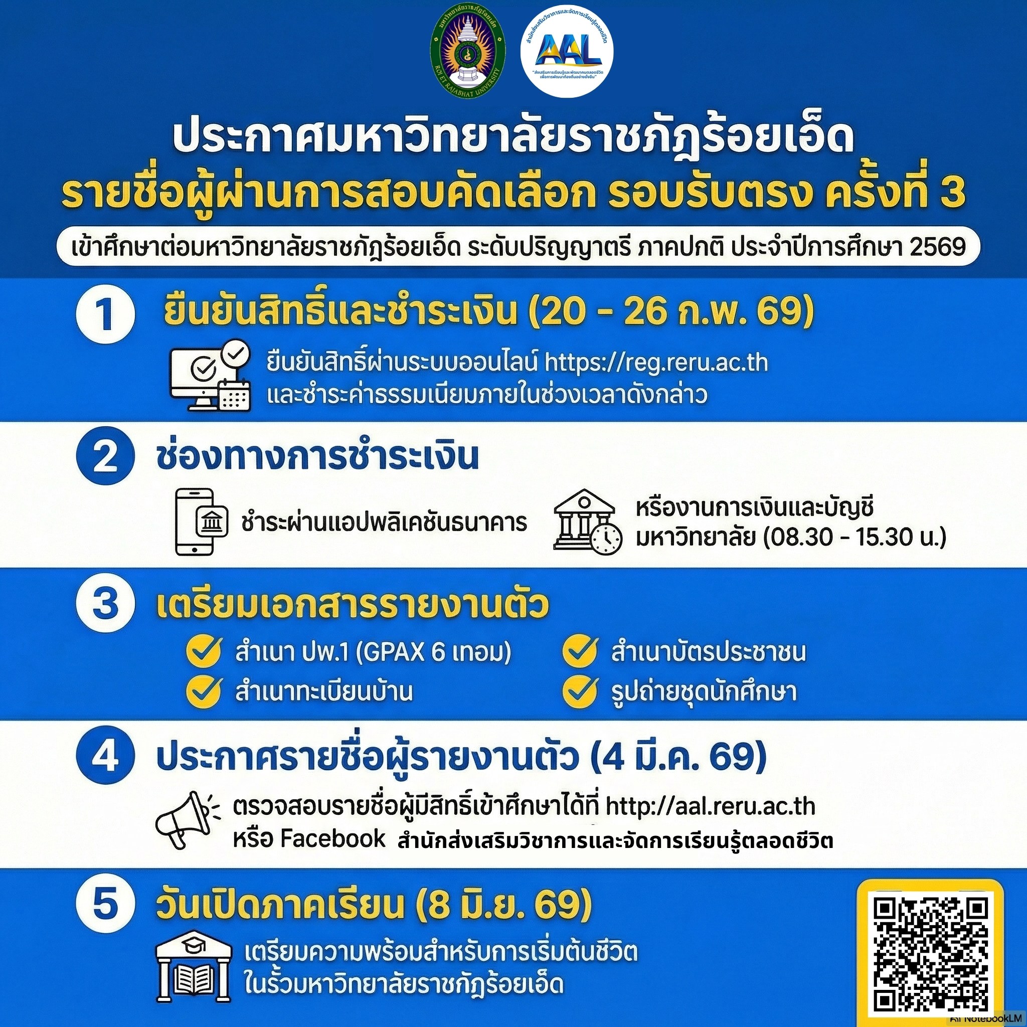 ประกาศมหาวิทยาลัยราชภัฏร้อยเอ็ด เรื่อง รายชื่อผู้ผ่านการสอบคัดเลือกเข้าศึกษาต่อมหาวิทยาลัยราชภัฏร้อยเอ็ด ระดับปริญญาตรี ภาคปกติ รอบรับตรง ครั้งที่ 3 ประจำปีการศึกษา 2569