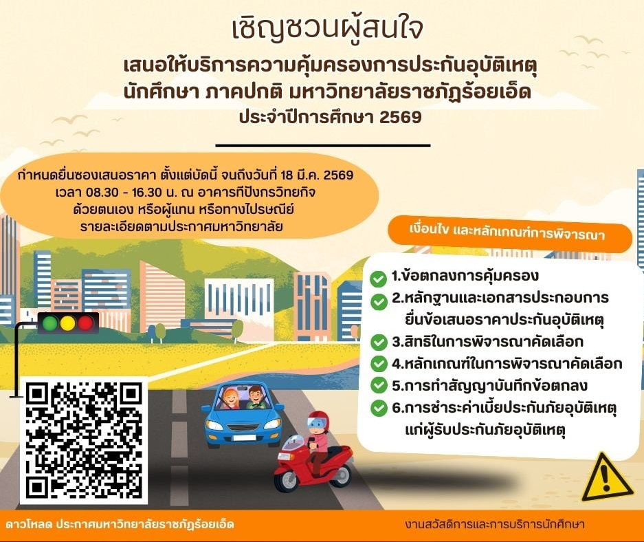 เชิญชวนผู้สนใจเสนอให้บริการความคุ้มครองการประกันอุบัติเหตุ นักศึกษา ภาคปกติ มหาวิทยาลัยราชภัฏร้อยเอ็ด ประจำปีการศึกษา 2569