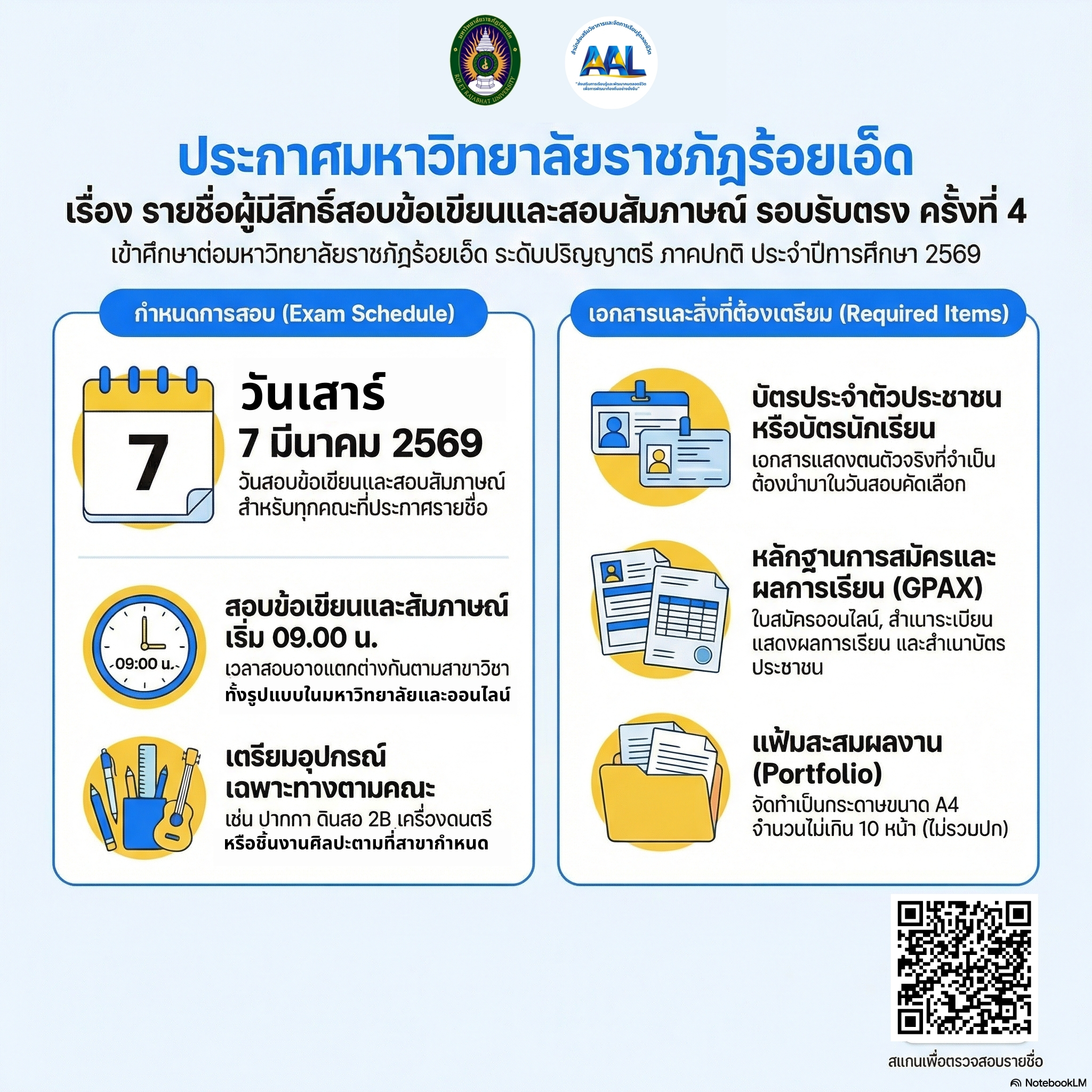 ประกาศมหาวิทยาลัยราชภัฏร้อยเอ็ด เรื่อง รายชื่อผู้มีสิทธิ์สอบข้อเขียนและสอบสัมภาษณ์ นักศึกษา ภาคปกติ รอบรับตรง ครั้งที่ 4 เพื่อเข้าศึกษาต่อมหาวิทยาลัยราชภัฏร้อยเอ็ด ประจำปีการศึกษา 2569