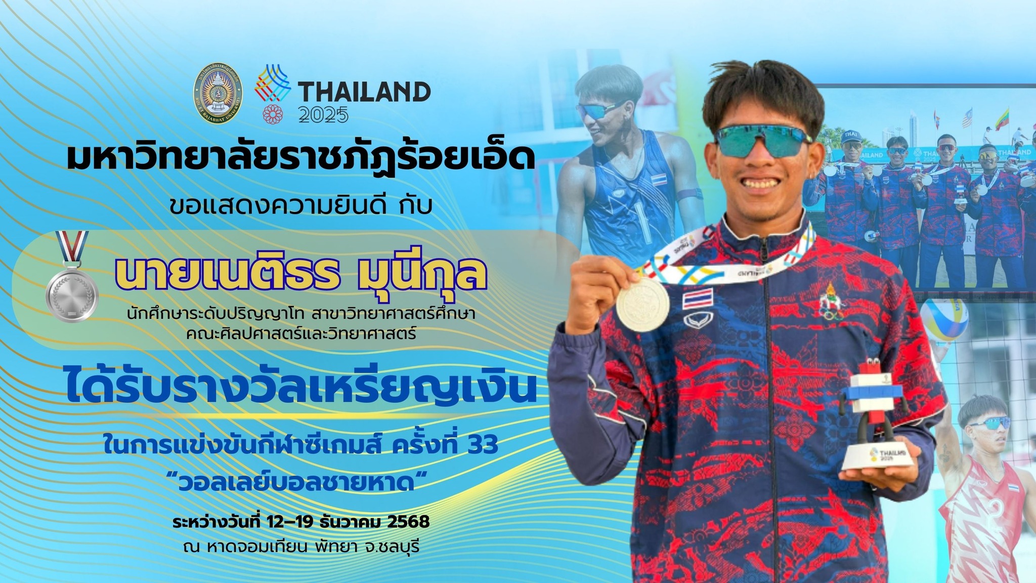 ขอแสดงความยินดีอย่างยิ่ง มหาวิทยาลัยราชภัฏร้อยเอ็ด ขอแสดงความยินดีกับ นายเนติธร มูนิกุล นักศึกษาระดับปริญญาโท สาขาวิทยาศาสตร์ศึกษา คณะศิลปศาสตร์และวิทยาศาสตร์ ในโอกาส ได้รับรางวัลเหรียญเงิน จากการแข่งขันกีฬาซีเกมส์ ครั้งที่ 33 ประเภท วอลเลย์บอลชายหาด ระหว่างวันที่ 12–19 ธันวาคม 2568 ณ หาดจอมเทียน พัทยา จังหวัดชลบุรี นับเป็นความภาคภูมิใจของมหาวิทยาลัย และเป็นแบบอย่างที่ดีด้านความมุ่งมั่น อดทน และความสามารถทางกีฬา ![]()